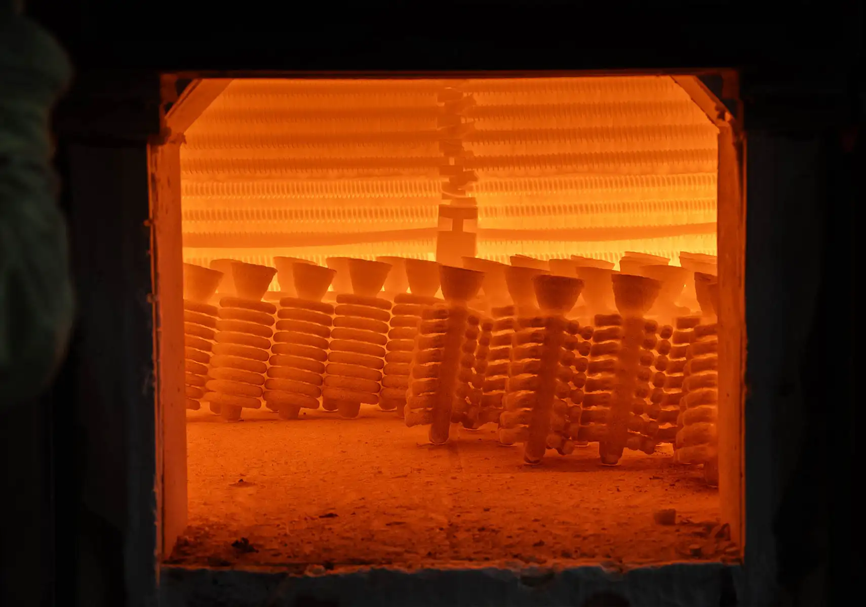 Eritilen metal, döküm reçetesinde belirtilen derece sıcaklıkta olan, önceden ısıtılmış seramik kalıplara dökülür.